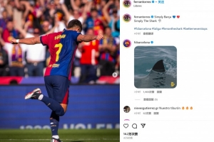 费兰-托雷斯也在赛后通过社媒晒出自己的庆祝照,并配文:“依然巴萨!依然鲨鱼!”自信而贪婪的鲨鱼精神也是费兰近年一直反复推崇强调的。